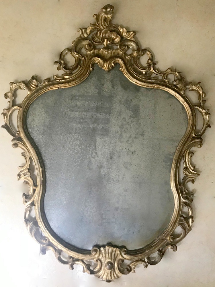 Antica specchiera in legno intagliato e dorato a mecca di forma sagomata (cm 98X74)(difetti e mancanze)