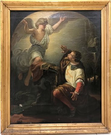 Ignoto lombardo della metà del XIX Secolo "Episodio dalla Gerusalemme Liberata di Torquato Tasso" olio su tela (cm 63x50.5) Al retro sul telaio iscrizione. In cornice (difetti)