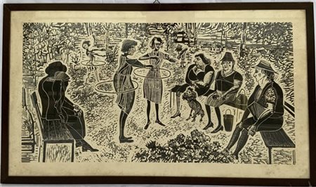 Stampa raffigurante ragazze con hula-hoop cm 45x82. In cornice (difetti)