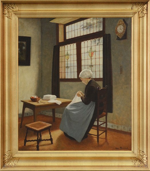 Van Booch "Interno con cucitrice" olio su tela (cm65x55) Iscritto in basso a des