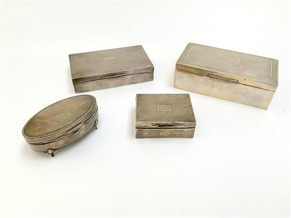 Lotto di quattro scatoline in lamina d'argento. Marchi di Birmingham, prima metà del secolo XX (difetti)
