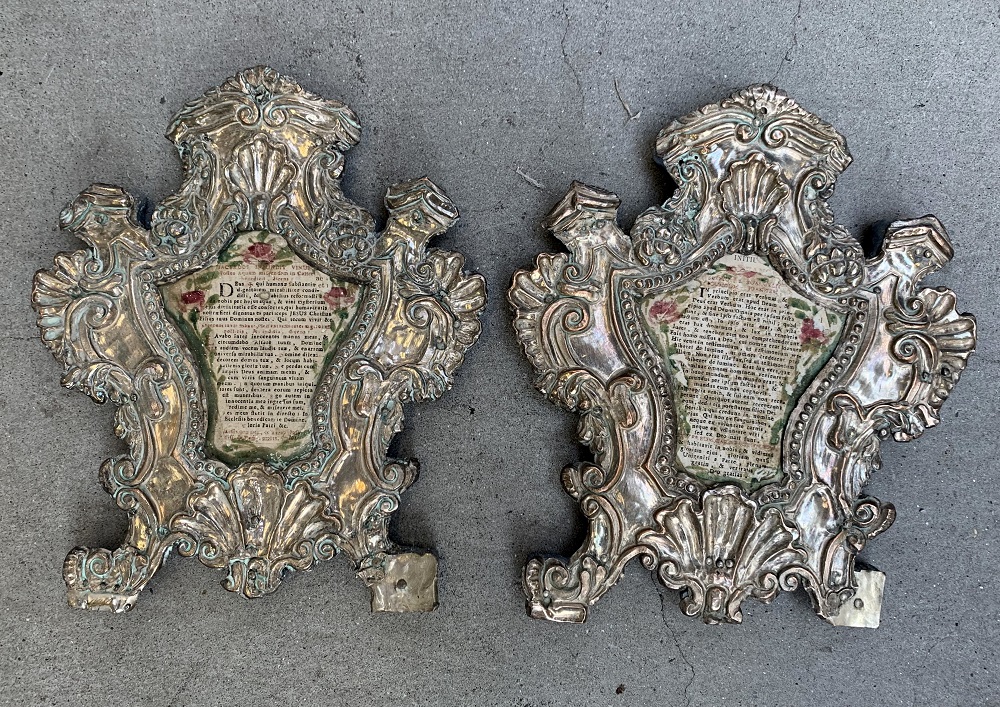 Due cartagloria di forma sagomata in metallo sbalzato a volute, fiori e motivi