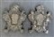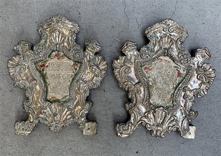 Due cartagloria di forma sagomata in metallo sbalzato a volute, fiori e motivi a conchiglia,secolo XIX (cm 27x22) (difetti e mancanze)