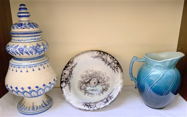 Manifatture diverse. Lotto composto da una brocca Villeroy & Boch, un catino ed un vaso con coperchio in cermaica con decori diversi, misure diverse (h max cm 52) (difetti e restauri)