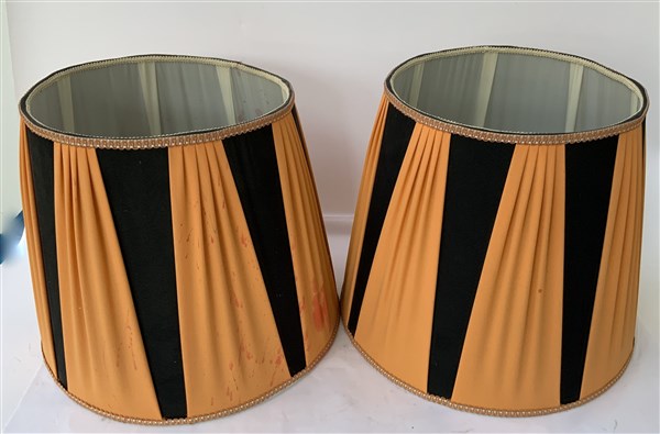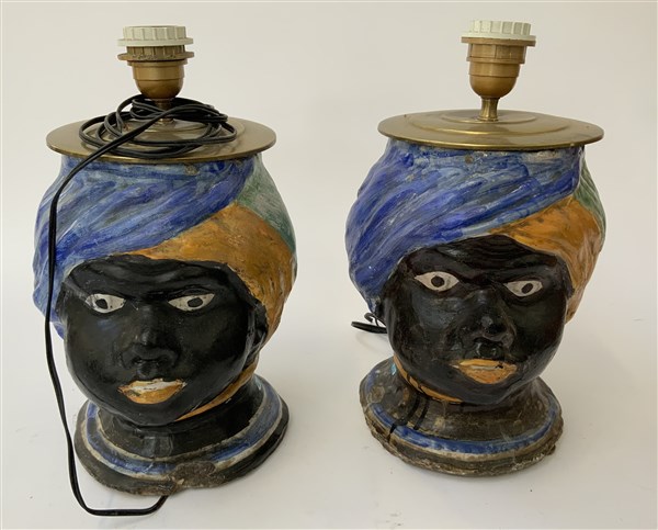 Coppia di vasi montati a lampada in ceramica policroma raffiguranti volti maschili, paralumi in tessuto (h cm 75) (difetti)