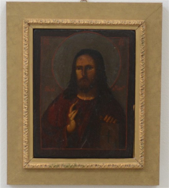 Icona ad olio su tavola raffigurante Cristo Pantocratore (cm 17,5x14) Russia, secolo XIX. In cornice dorata (restauri)
