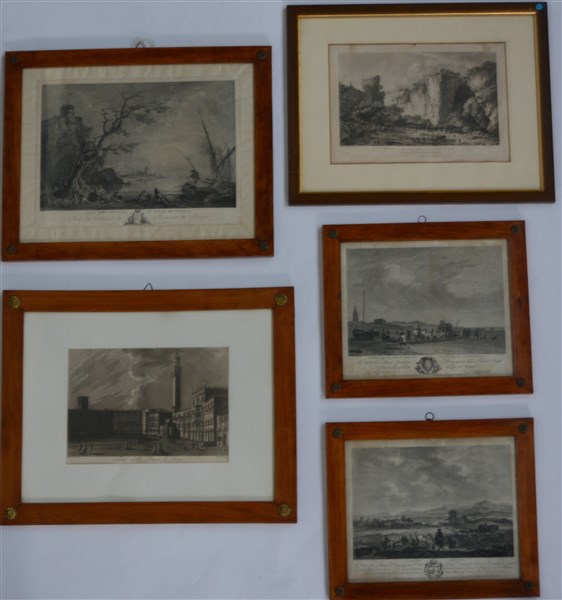 Lotto di cinque antiche incisioni raffiguranti paesaggi, autori e misure differenti, in cornici (difetti)