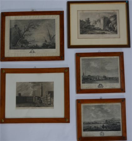 Lotto di cinque antiche incisioni raffiguranti paesaggi, autori e misure differ