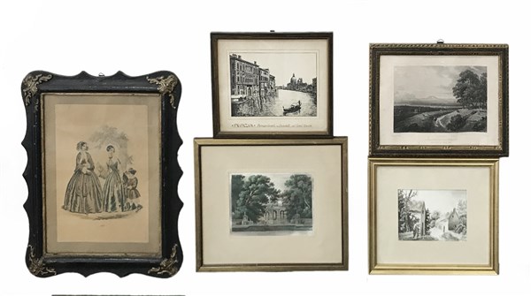 Lotto composto da tre acquarelli e due stampe raffiguranti scorci, paesaggi e figure, in cornici (difetti)