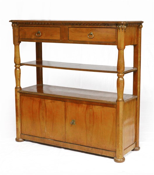 Mobile etagere con due ante nella parte inferiore, due ripiani e due cassetti nella parte superiore. Montanti anteriori torniti (cm 134x 130x44) (difetti)