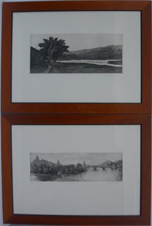 Lotto di due acqueforti raffiguranti scorci di paesaggi, di autori diversi