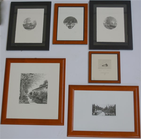 Lotto composto da sei acqueforti raffiguranti uccelli e paesaggi, di misure e a