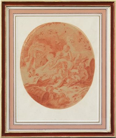 Giuseppe Frascheri (1809-1886) (attr.) "La piccola società" matita rossa e acquerello rosso su carta ovale (cm 33x28). Siglato "G.F." in basso a destra. In cornice