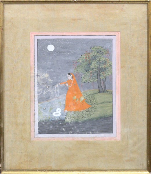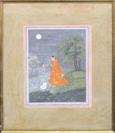 Arte indiana "Figura femminile in un paesaggio" tempera (cm 24x18) in cornice, secolo XX (difetti)