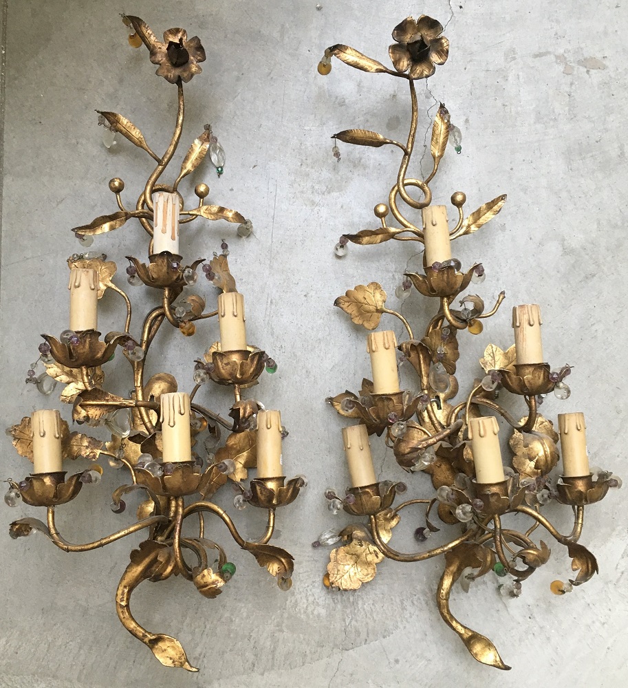 Quattro appliques a sei fiamme in metallo dorato a forma di rami con fiori e foglie e con pendagli in vetro (h cm 65) (difetti)