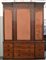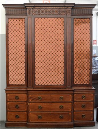 Libreria a due corpi in mogano, parte superiore a tre ante decorate da grate in metallo dorato e cesellato a fiori, parte inferiore a nove cassetti filettati e intarsiati, cappello aggettante. Base munita di rotelle. Stampigliata EDWARDS & ROBERTS sul primo cassetto della parte centrale, Inghilterra secolo XIX (cm 202x264x50) (difetti)