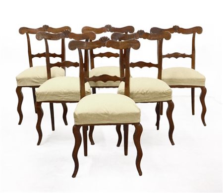 Gruppo di sei sedie con schienale a giorno decorato da conchiglia. Gambe anteriori sagomate, posteriori a sciabola (difetti)