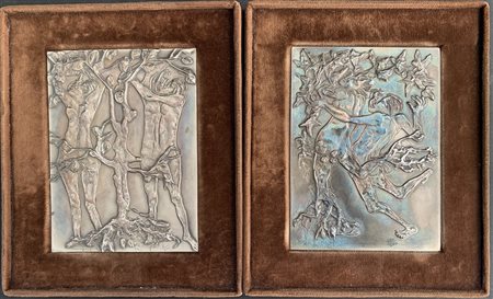 "Adamo ed Eva" due altorilievi in lastra d'argento(cm 15x11) in cornici di velluto, firmati e numerati in lastra, edizione di 500 esemplari (lievi difetti)
