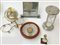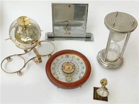 Lotto composto da due barometri, un orologio da tavolo, un orologio da taschino con supporto e una clessidra (difetti).
