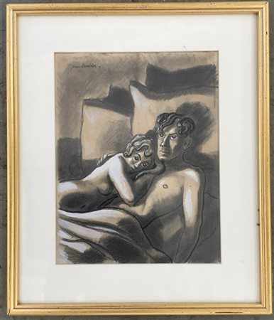 Firma indecifrata "Gli amanti" tecnica mista su carta (cm 27x21) Firmato in alto a sinistra. In cornice