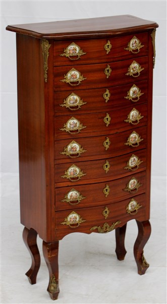 Cassettiera a otto cassetti con prese decorate da placche con scene galanti in policromia. Montanti decorati da applicazioni in metallo dorato (cm 53x100x27) (lievi difetti)