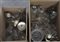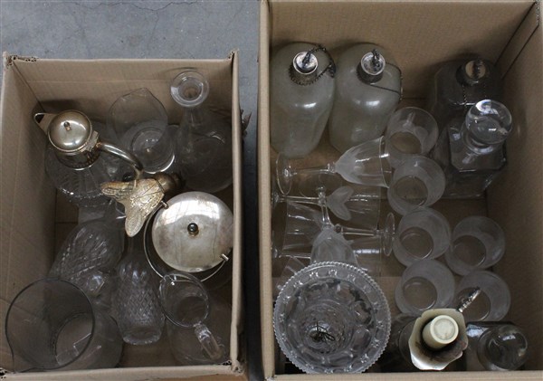 Lotto composto da due cartoni contenenti bicchieri, bottiglie e vasi in vetro di diverso decoro, alcuni con ghiere in argento (difetti)