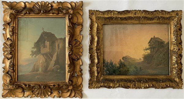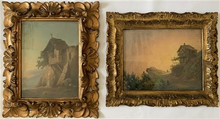 Lotto di due dipinti ad olio su cartoncino. "Pastorelli in preghiera" siglato in basso a destra e "Paesaggio con casolare" (cm 21,2x17 e 18,5x23) In cornici (difetti)