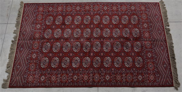 Tappeto meccanico, secolo XX. Decoro Boukhara con fondo rosso. (cm 258x168) (di