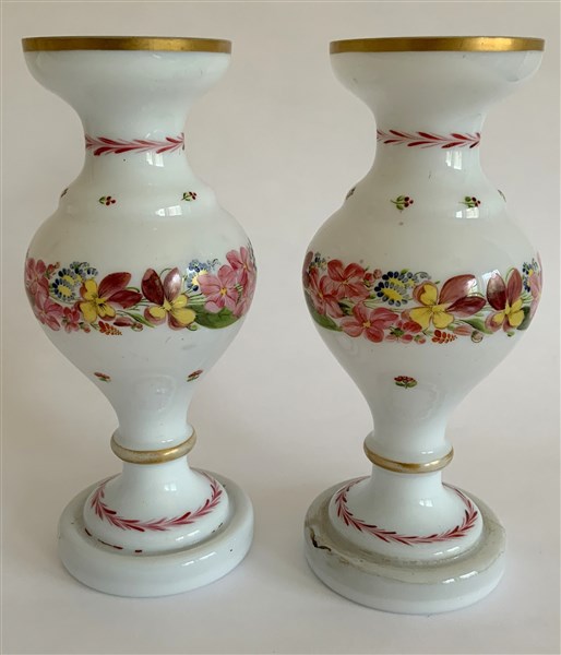 Coppia di vasi in opaline a decoro floreale su fondo bianco, secolo XIX (h cm 25) (difetti)