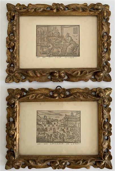Coppia di antiche xilografie raffiguranti una piazza e un banchetto (battute cm 6x8,3), in cornici (difetti)