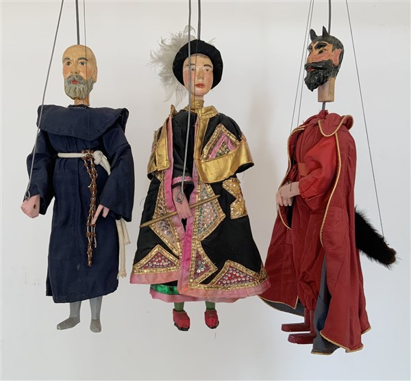 Gruppo di tre pupi siciliani raffiguranti il frate confessore di Carlo Magno, M