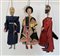 Gruppo di tre pupi siciliani raffiguranti il frate confessore di Carlo Magno, Mago Merlino e la tentazione di Rinaldo. Tessuto e paillettes. Manifattura palermitana Monteleone (h max cm 46) (difetti e mancanze)