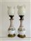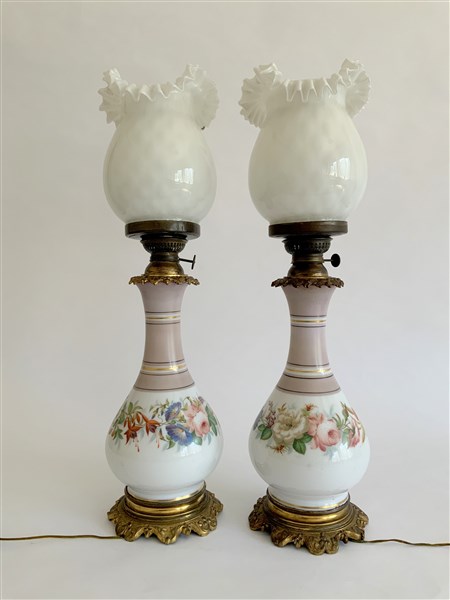 Coppia di lampade da tavolo in opaline dipinte con fascia di fiori, guarnizioni