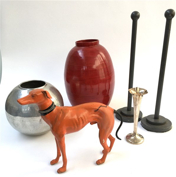 Lotto composto da una scultura in metallo raffigurante un cane, una coppia di fermaporte, un vaso soliflore in metallo argentato ed altri due vasi di materiali differenti (difetti)