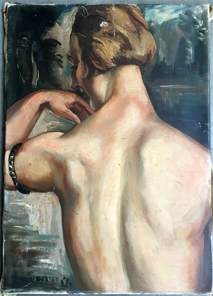 André Favory "Ritratto femminile di schiena" olio su tela (cm 65x46) Firmato in
