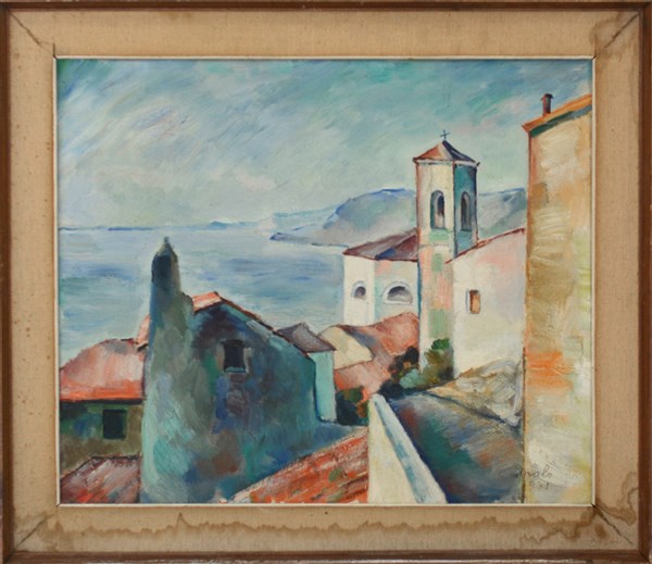 Emilio Molo "Motivo di Trieste" 1971 olio su tela, cm 50x60 Firmato e datato in