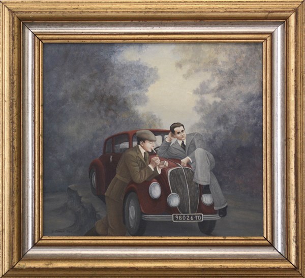 Daniela Campo "Un'automobile color amaranto" 1982 olio su tavola, cm 30x33,5 Fir