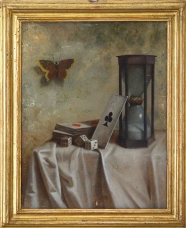 Ignoto Natura morta con clessidra, carte da gioco e dadi Olio su tavola cm 27x21