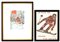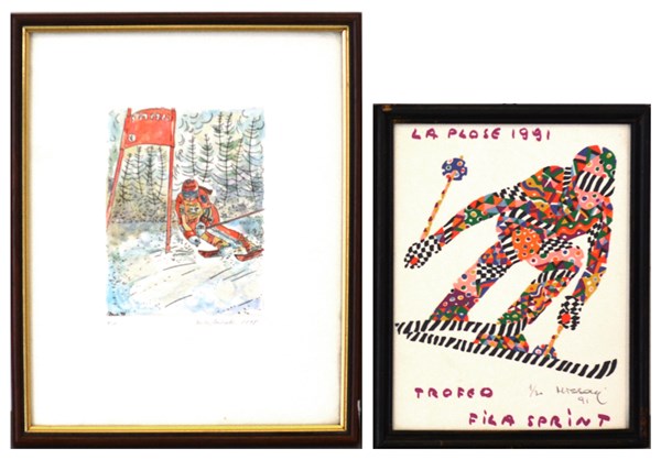 Lotto di due stampe raffiguranti sciatori, misure diverse. In cornici Provenie