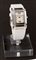 Cassa in oro bianco, di forma, in due parti con anse mobili; carure a gradini, impreziosita da una doppia fila di diamanti taglio brillante. Diamante cabochon in corona; quadrante con indici in diamanti taglio brillante e numeri romani in oro