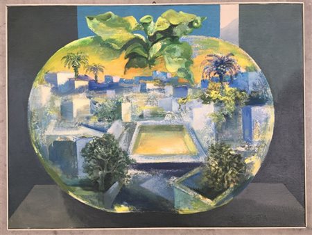 Ercole Pignatelli "Frutto trasparante e paesaggio" 1975 olio su tela, cm 60x80