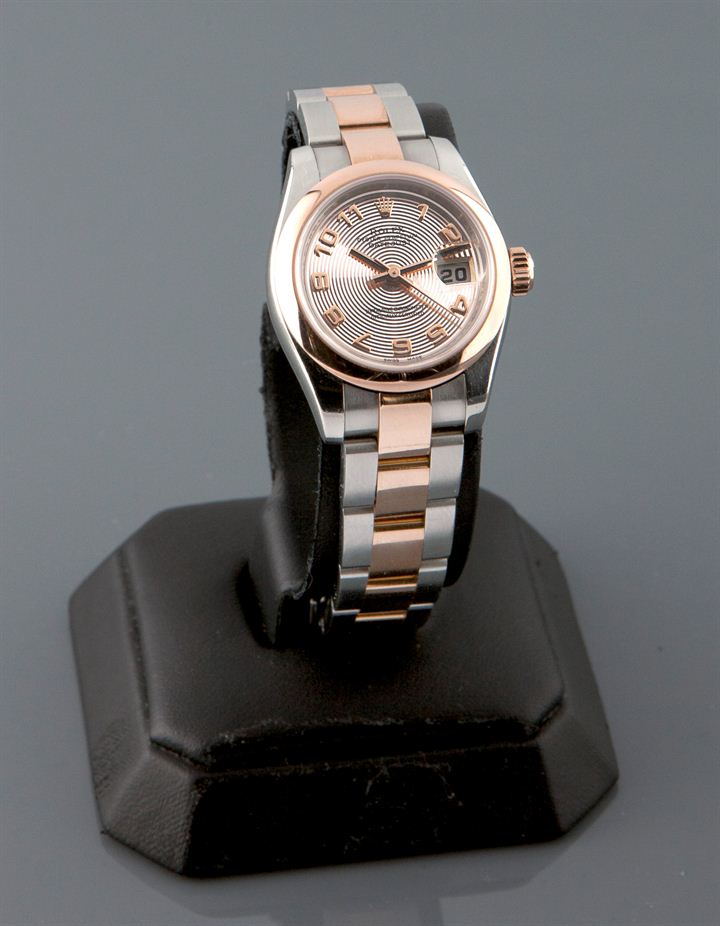 Cassa oyster in acciaio ed oro rosa, in tre parti con fondo e corona a vite; bracciale oyster in acciaio ed oro rosa; quadrante rifinito a cerchi concentrici con numerazione araba applicata in oro rosa