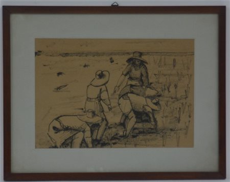 Firma indecifrata Bozzetto a tecnica mista su carta, raffigurante mondine cm 22x
