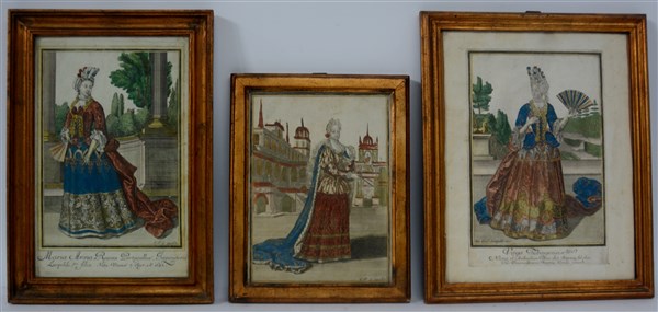 Lotto di tre incisioni a colori del sec. XVIII raffiguranti regnante e nobildonne misure diverse (max cm 34x26) (difetti)