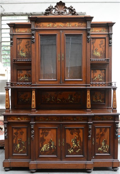 Grande credenza a due corpi di struttura architettonica decorata con pannelli dipinti e intarsiati in finto avorio con scene di caccia (cm 199x264x61) (difetti e mancanze)