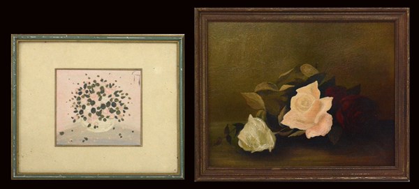 Lotto composto da due quadretti raffiguranti fiori, misure diverse, in cornici (difetti)