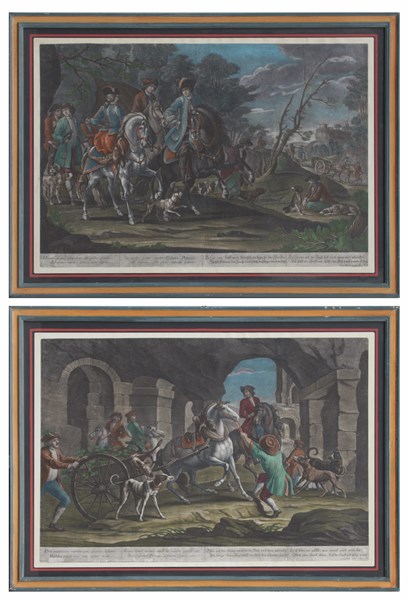Coppia di antiche incisioni colorate raffiguranti scene di caccia del secolo XVIII. Produzione seconda metà secolo XIX. In cornice (cm 50x70) (difetti)
