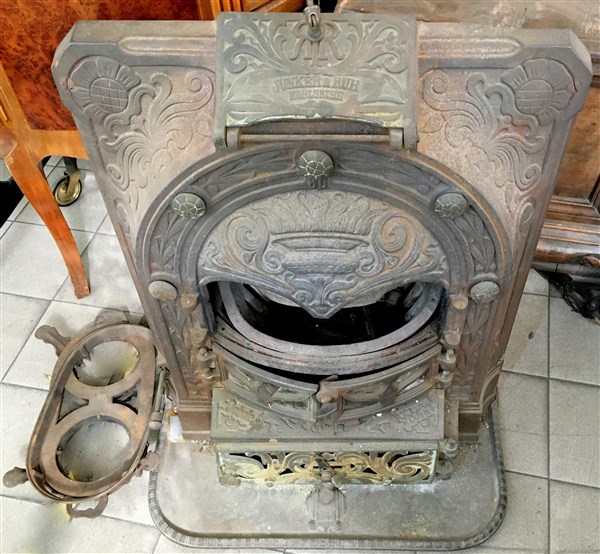 Stufa in ghisa marcata Junker & Ruh con decoro a motivi floreali (difetti e mancanze)