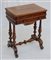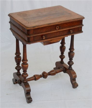 Tavolino da lavoro con sostegni torniti riuniti da traversa e due cassetti nella fascia e un porta spolette. Secolo XIX (cm 58x77x43) (difetti)