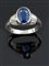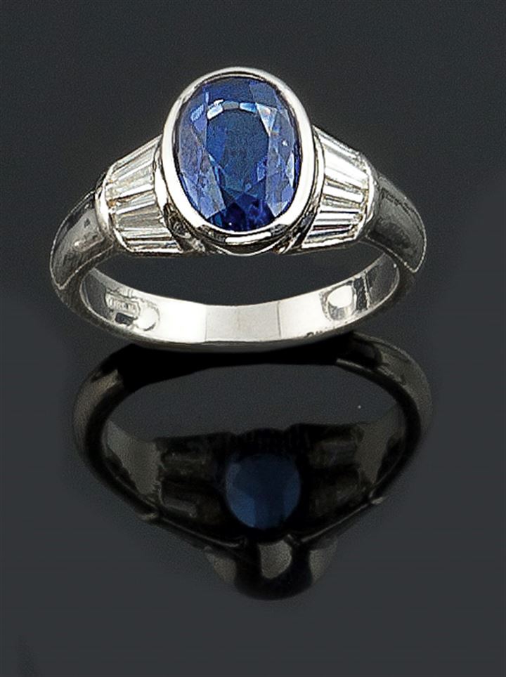 Anello in oro bianco con al centro zaffiro taglio ovale di ct 2,60 ca; ai lati diamanti taglio trapezio